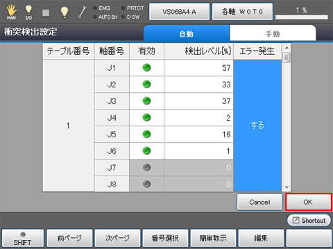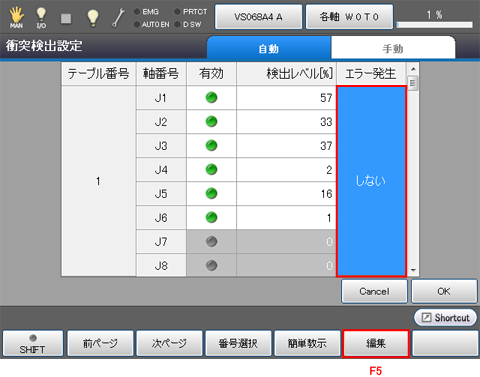 「衝突検出設定画面」でエラー発生有無を設定するテーブル番号を選択し、[F5 編集]を押します。