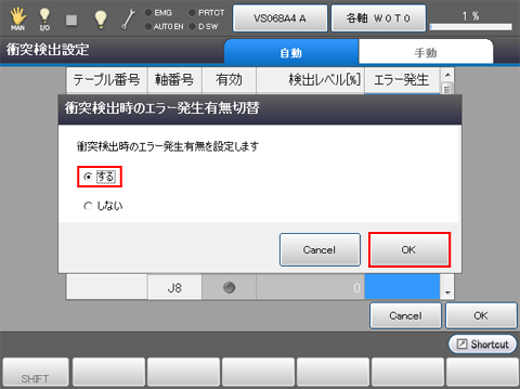 「衝突検出時のエラー発生有無切替画面」が表示されますので、[する]を選択し、[OK]を押します。