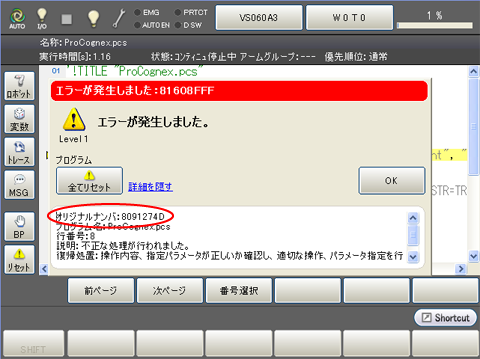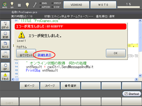Cognex In-Sightプロバイダにて、正しくないコマンドを実行した場合に独自エラーが起こる例です。