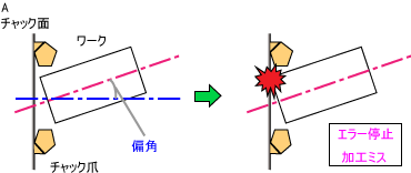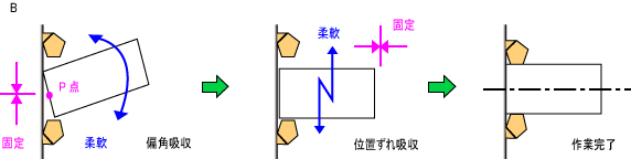 以上の不具合を発生させない為に、コンプライアンス機能を使用することで位置ずれを吸収することが可能になり、結果、エラーの発生を防ぐことができます(B参照)。