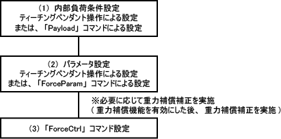 ForceCtrl時にロボット停止状態のトルクと重力補償トルクとを比較し、誤差分を補正します。しかし、ロボットが接触等で外力を受けた状態でForceCtrlを実行した場合、補正値に誤差が生じます。外力(重力を除く)を受けない状態でForceCtrlを実行してください。外力を受けた状態で力制限有効にする場合は、GrvCtrlにて重力補償を有効にした後、GrvOffsetを使用してください。
