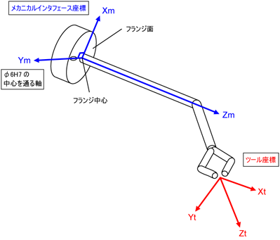 ロボットのアーム先端にある、ツール取付け面のことを、フランジと呼びます。また、フランジ中心を原点とする3次元直交座標をメカニカルインタフェース座標系と呼びます。
