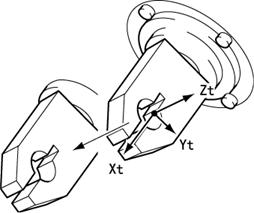 ツール座標系とは、フランジに取付けたツール先端を原点とする3次元直交座標系です。メカニカルインタフェース座標の原点を基準に、オフセット量や回転の角度を定義します。