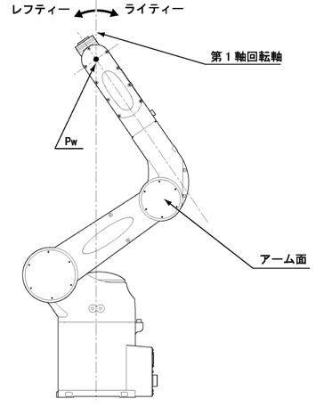 アーム面に対して垂直方向から見た「Pw」の位置が、第1軸の回転軸より左にある場合がレフティー(LEFTY)形態で移動可能な範囲、右にある場合がライティー(RIGHTY)形態で移動可能な範囲です。