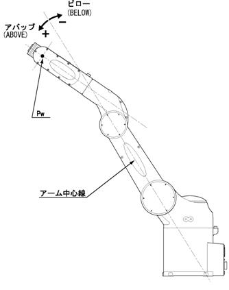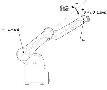 アーム中心線に対して、「Pw」の位置が+側にある場合がアバッブ(ABOVE)形態で移動可能な範囲、-側にある場合がビロー(BELOW)形態で移動可能な範囲です。