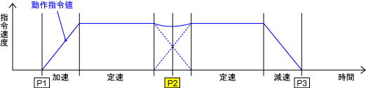 動作指令値(モータの命令波形)がP2に達した時点で、P3への移動が開始します。
