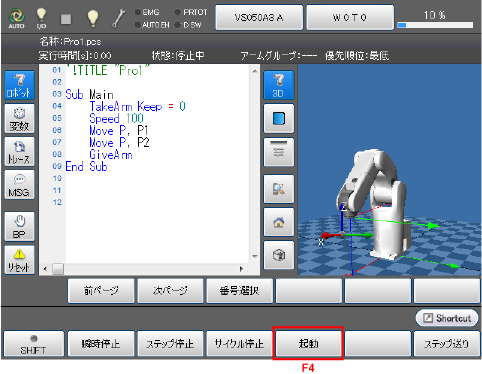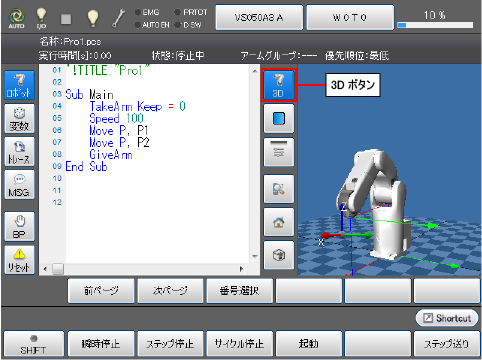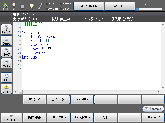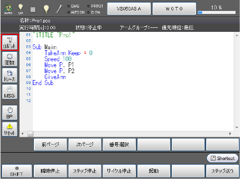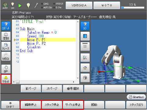 - サイクル停止 : サイクル停止を実行すると、プログラムのEnd Sub命令で停止します。ロボットを連続起動で動かした場合に使用します。