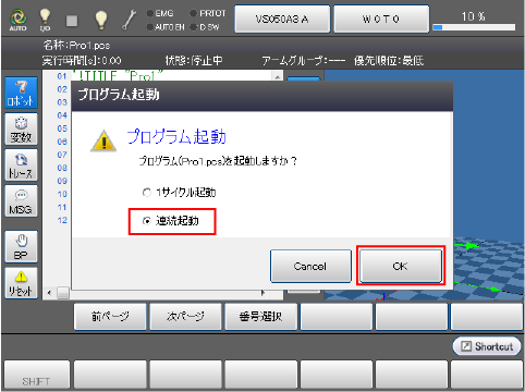 メッセージが現れるので、選択して[OK]を押します。今回は連続起動を選択します。