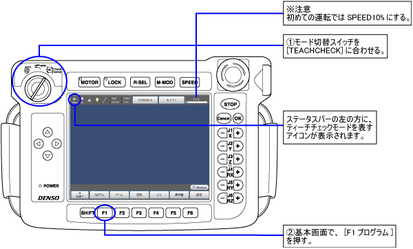 ティーチングした結果のプログラムの動作を手動で検査することをティーチチェックといいます。ティーチチェックは、ティーチチェックモードで行ないます。