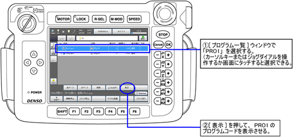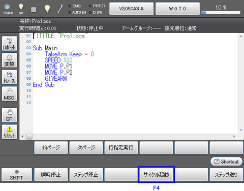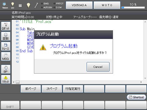 プログラムがサイクル起動され、ロボットが動くと同時に、プログラムリストの反転表示が順に進みます。