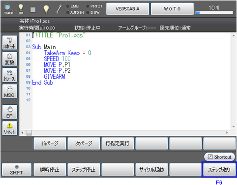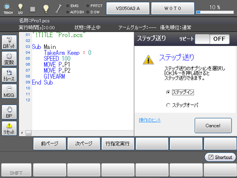 ステップ送りの行を実行中に[OK]を放した場合は、一時停止の状態になります。