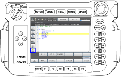 ティーチチェックモードでは、デッドマンスイッチと[OK]を同時に押している間のみプログラムが実行されます。いずれかのボタンを離すとロボットは瞬時停止します。