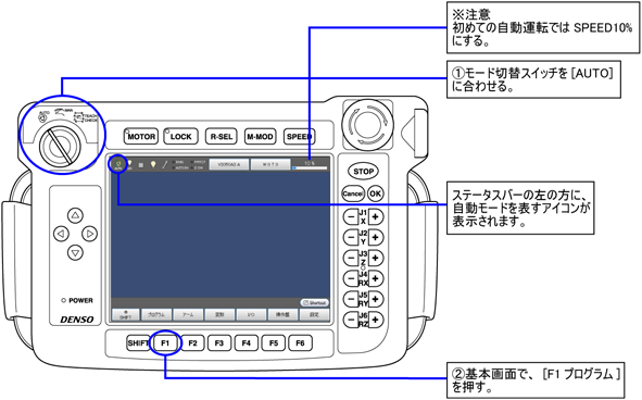初めて自動モードで運転するプログラムは、速度設定を10%程度にして、運転を始めてください。手動モードやティーチチェックモードでは、自動モードの10%の速度で動くようになっていますが、自動運転では最高速度で動かすことができます。