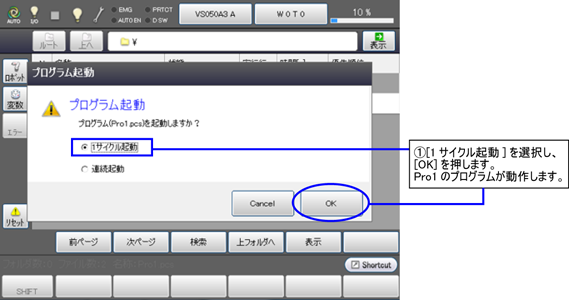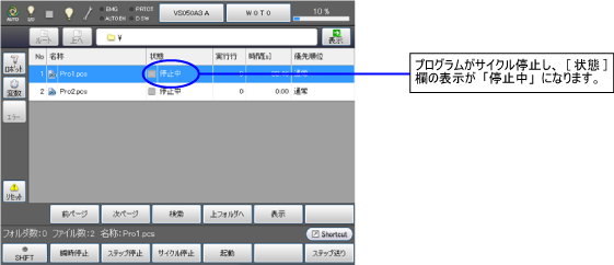 サイクル停止を実行すると、プログラムのEnd Sub命令で停止します。ロボットを連続起動で動かした場合に使用します。