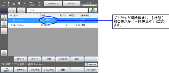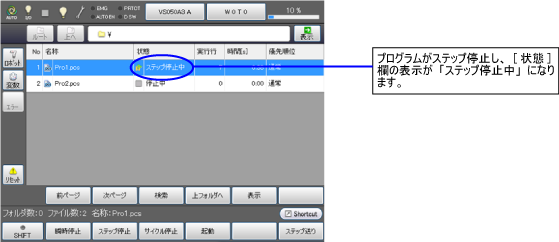 ステップ停止を実行すると、ボタンが押された時に実行していたステップが完了すると停止します。