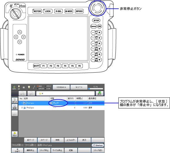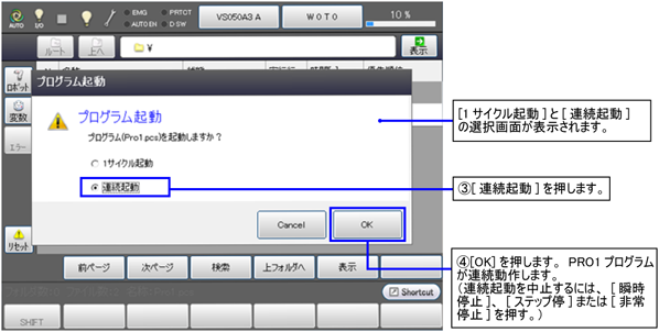 非常停止(ロボット停止)後、そのまま再起動操作を行うと、選択されたプログラムの先頭から実行されます。