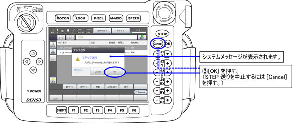 ステップ停止後そのまま再起動操作を行うと、ティーチングペンダントに表示されている現ステップの次の実行行ステップから、ただちに動作を開始します。
