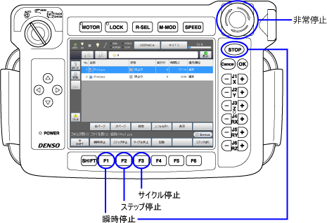 ロボット停止操作には、次に紹介する4つの操作があります。ここでは、それぞれの意味と操作方法を紹介します。