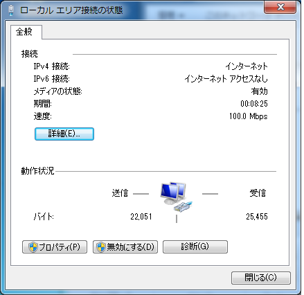 [ローカルエリア接続]アイコンにマウスを合わせクリックすると[ローカルエリア接続の状態]ダイアログが表示されます。