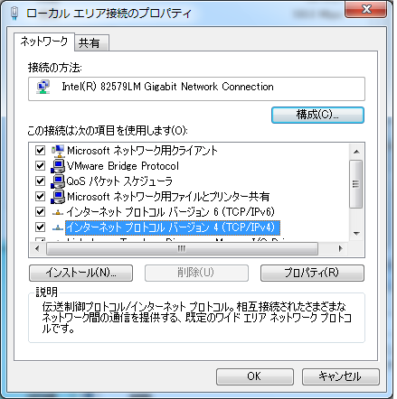 まず、ローカルエリア接続が有効になっている事を確認します。次に、TCP/IPのプロパティにIPアドレスを設定します。