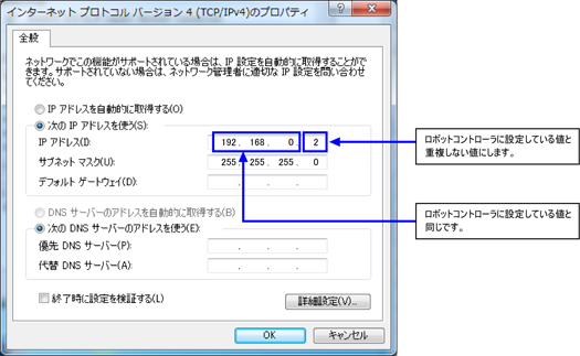 もし、そのネットワークがローカルなもの(たとえば、パソコンとロボットコントローラだけがつながるような環境)であれば、IPアドレスは自由に設定できますので、ここでは仮にIPアドレスを[192.168.0.2]、サブネットマスクを[255.255.255.0]とします。