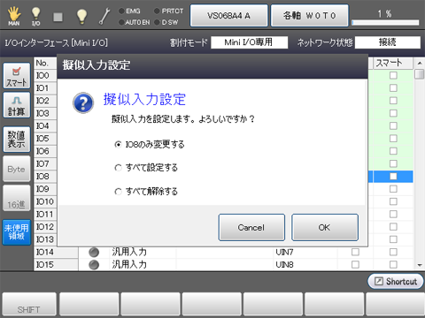 [F4 擬似スマート]を押すと、[擬似入力設定]ウィンドウが表示されるので、「IO8のみ変更する」を選択し、[OK]を押します。