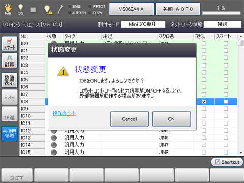 擬似的にI/O入力を設定すると、該当するポートをティーチングペンダントにてON/OFFの切り替えができます。
