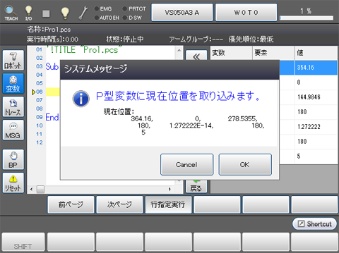 前記の「変数の値を変更する」のStep2で、P型、J型、T型の変数の場合は、[位置取込」ボタンが表示されます。このボタンを押すと、現在位置を変数に登録することができます。