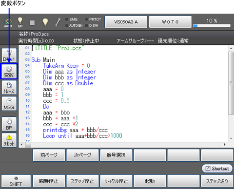 変数ボタンを押すと、実行中のプログラムで使用されている変数が表示されます。