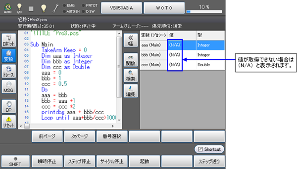 Integer(Long) / Single(Float) / Double / String / Vector / Position / Joint / Trans / DefIO / Object - エラー発生時、ローカル変数の値を見ることができます。(Ver.1.13.*以降)
