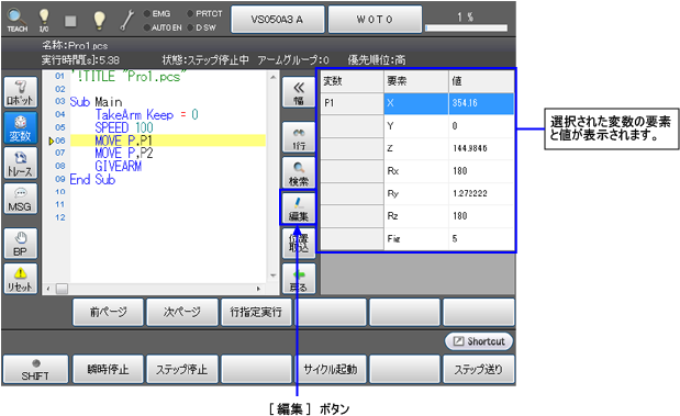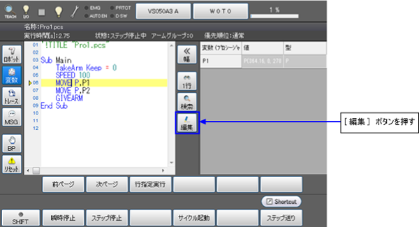 画面右側に変数が表示された状態で[編集]ボタンを押します。