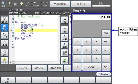 | [F5 編集] | 数値を変更したい変数番号を選択して[編集]を押すと、テンキーが表示されます。 T型、P型の各変数については、ロボットの動作形態(Fig)を設定することができます。 |