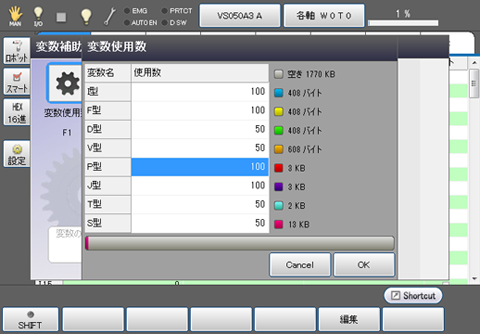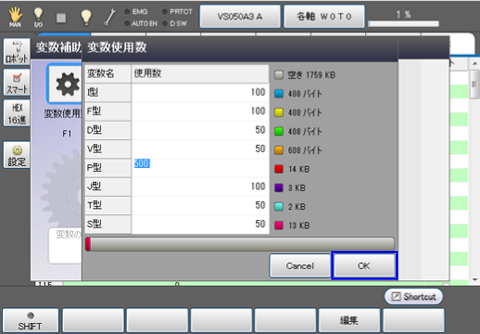 | [設定] | それぞれの変数の使用数を設定します。 ボタンを押すと、[変数使用数]ウィンドウが表示されます。 使用数を変更したい変数を選択した後、[F4 編集]を押すとテンキーが表示されますので、テンキーを使用して設定数を入力し、テンキー上の[OK]を押すと、使用数が変更されます。 変更した使用数は、[変数使用数]ウィンドウの[OK]ボタンを押すことで変更が確定します。 |