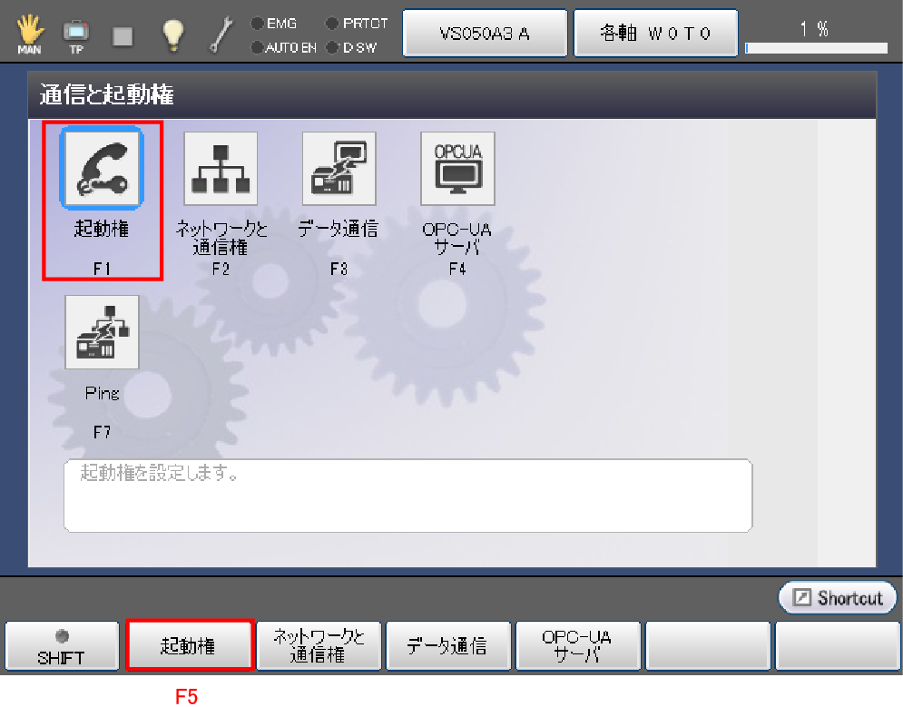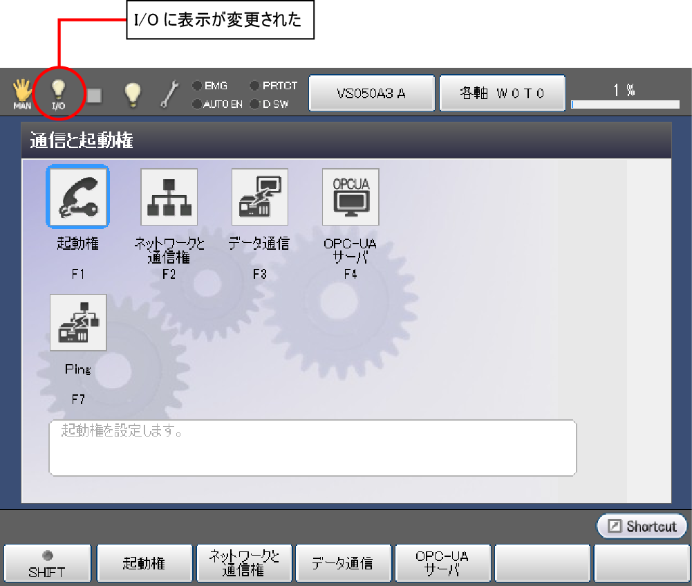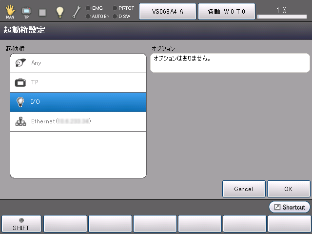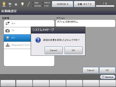 起動権はデフォルトはI/Oになっています。ティーチングペンダントになっている場合は以下の方法でI/Oに切替えます。