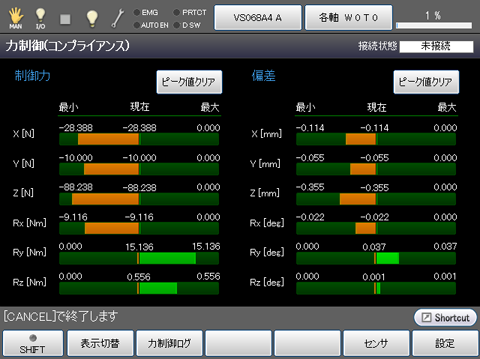 「力制御モニタ画面」が表示されますので、結果を確認し、パラメータの調整項目を決めます。