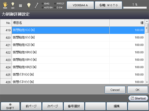 「力制御モニタ画面」の[F6 設定]または、[F12 詳細設定]を押し、「力制御設定画面」または、「力制御詳細設定画面」を開きます。