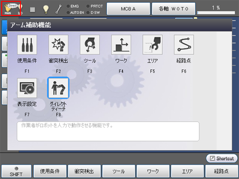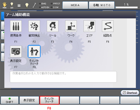 ダイレクトモードを終了する場合は、「アーム補助機能」画面で[F8 ダイレクトティーチ]を押します。