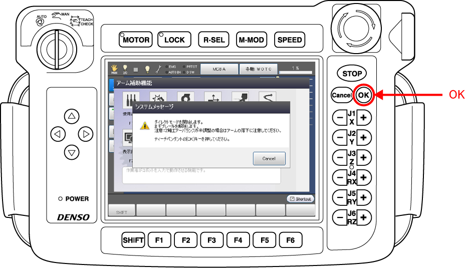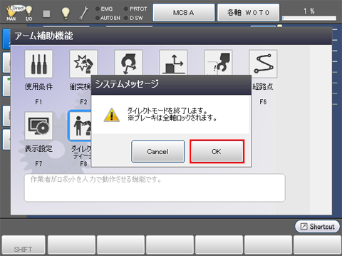 [Cancel]を押すと、ダイレクトモードの終了操作は無効となり、「アーム補助機能」画面に戻ります。
