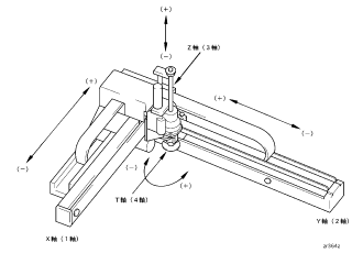 ロボット軸は軸数に応じて第1軸~第4軸を下図のような直角座標で構成することで、CP動作(直線、円弧動作)などのロボット命令が可能です。