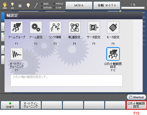 操作経路:基本画面 - [F2 アーム] - [F12 保守] - [F10 軸設定] - [F12 ロボット軸範囲設定]を押します。
