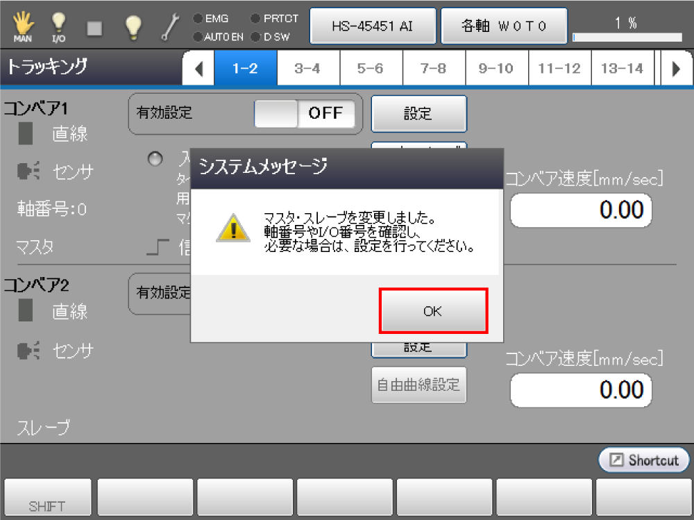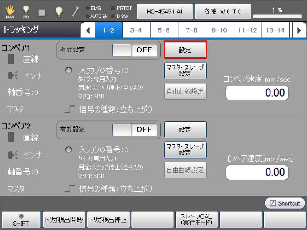 「トラッキング」画面において、マスタ設定にしたいコンベアに対して 画面上の[マスタ・スレーブ設定]ボタンを押します。