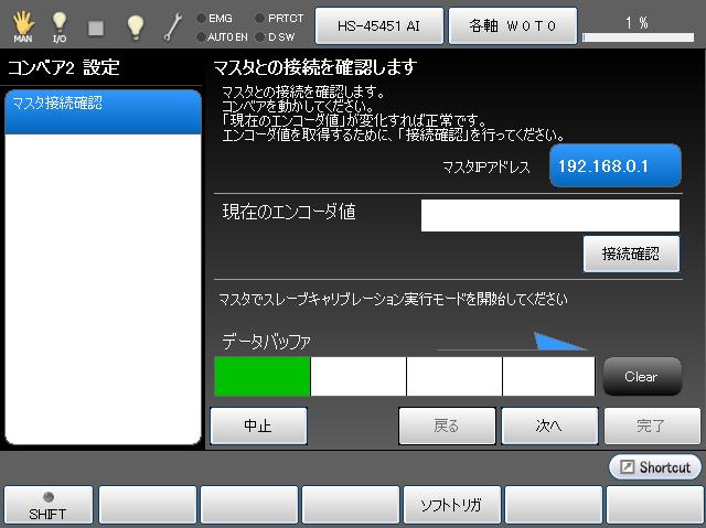 コンベアを作動させ、[現在のエンコーダ値]、[データバッファ]が変化することを確認します。値が変化すれば正常です。