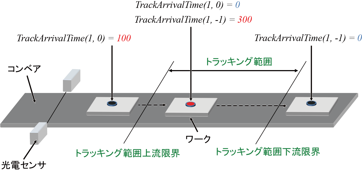 TrackArrivalTime (コンベア番号 [, 上流限界・下流限界の指定[, オフセット量]])