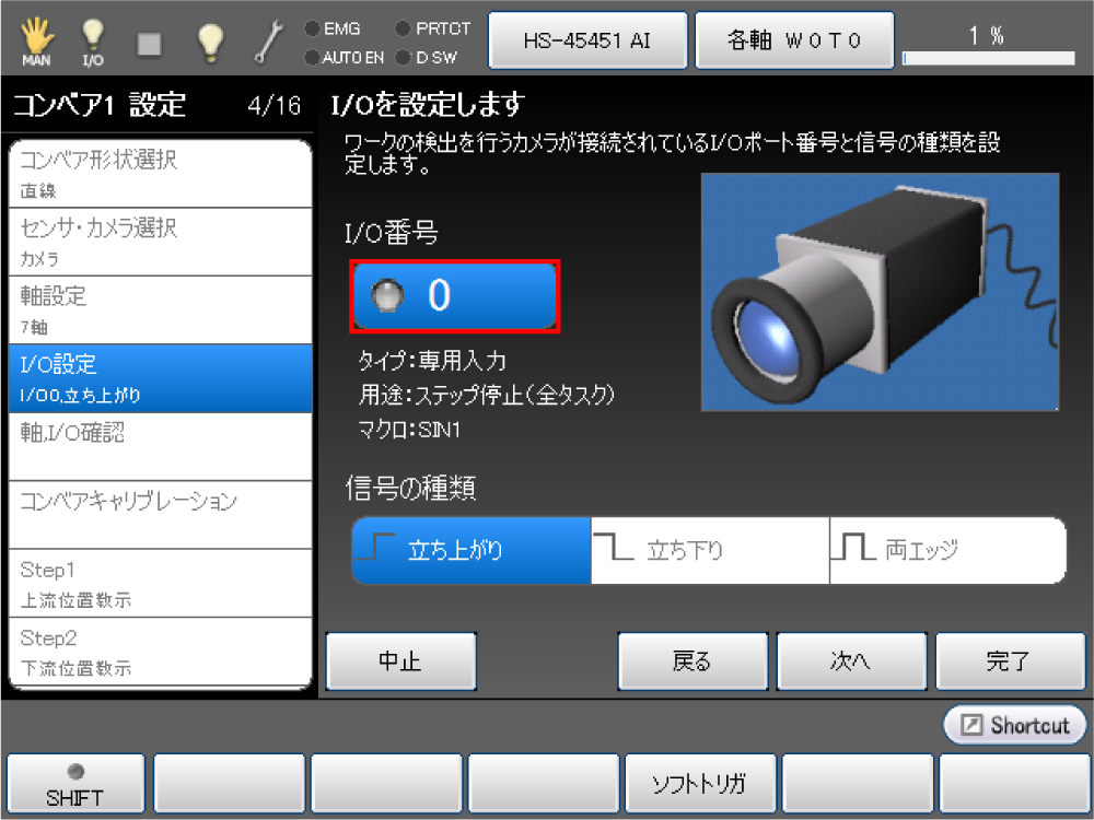 ワークの検出を行なうセンサが接続されているI/Oポート番号と、信号の種類を設定します。