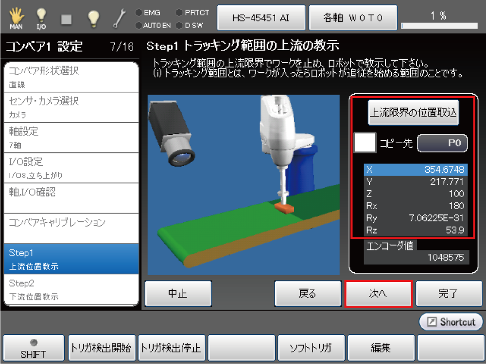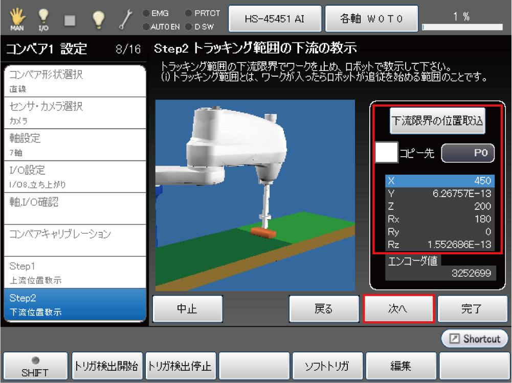 トラッキング範囲の上流側の限界位置でワークを止め、ロボットをワーク上へ移動し、[上流限界の位置取込]を押します。