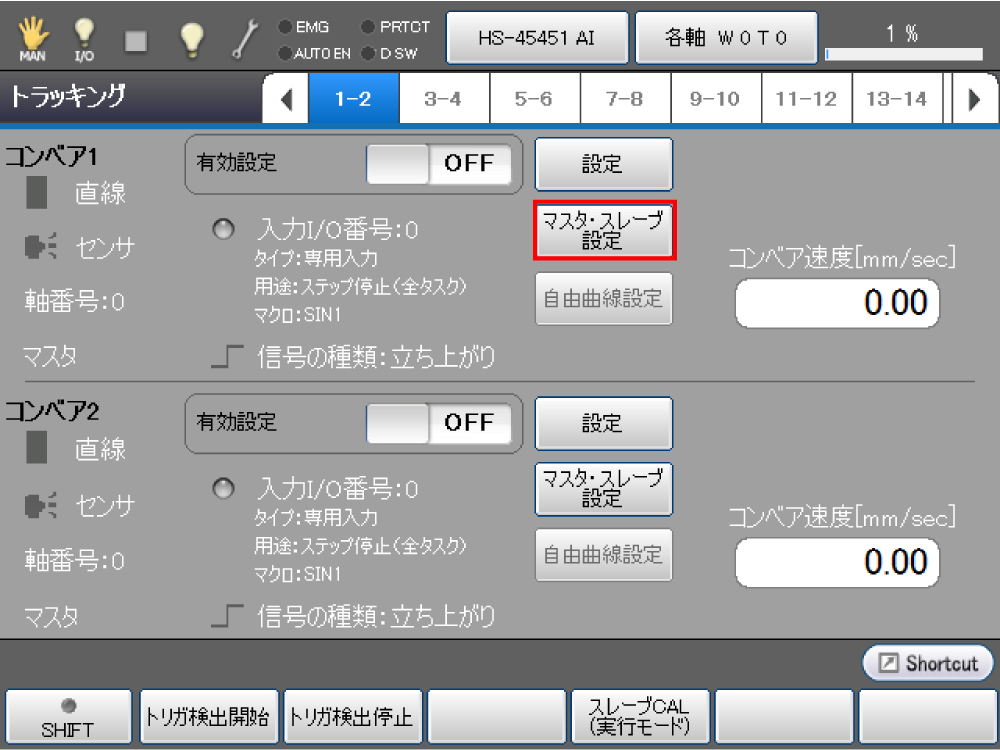 「トラッキング」画面において、マスタ設定にしたいコンベアに対して画面上の[マスタ・スレーブ設定]ボタンを押します。