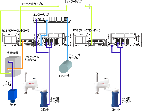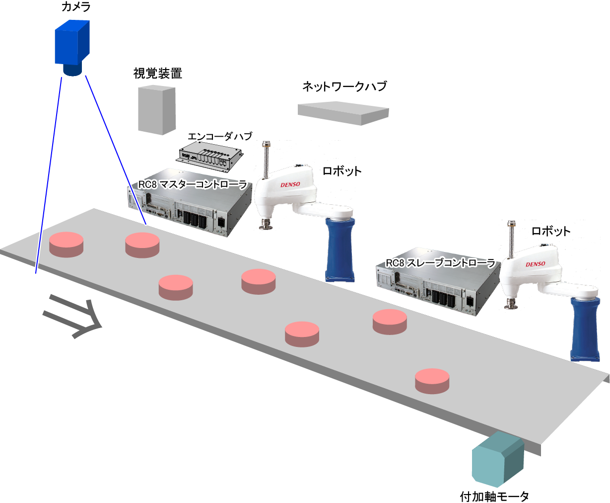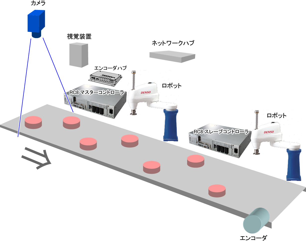 マスタコントローラは、視覚装置とエンコーダを接続し、ワークの位置情報の取り込みと、ロボットによるワークのピックアップを行ないます。