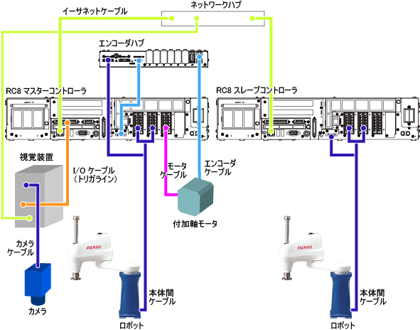 スレーブコントローラは、マスタコントローラとイーサネットケーブルで接続し、マスタコントローラで取り込んだワークの位置情報を基に、ワークのピックアップを行ないます。
