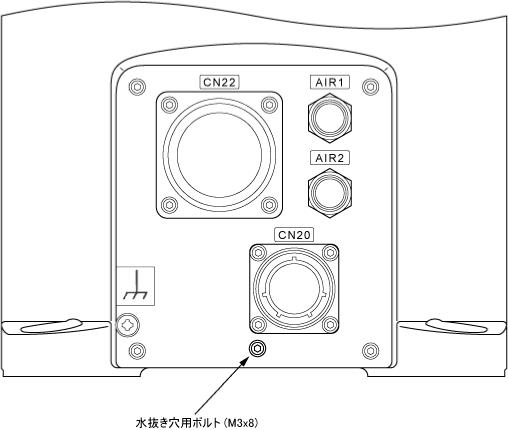 防塵防滴タイプのロボット本体底部に水抜き穴用のボルト(M3×8)が装着されています。ロボット本体を床置きで設置する場合には、下図に示す水抜き穴用のボルトを取外してご使用ください。