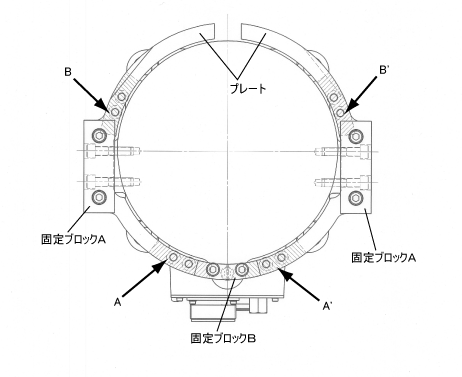 メカエンド変更をする場合は、メカエンド変更部品(ストッパ、固定ブロックA(2個)、固定ブロックB、プレート(2個)の4種類)が必要です。ストッパ、固定ブロックA、固定ブロックB、プレートの参考図面を示しますので、可動範囲を任意に設定して必要に応じてお客様にて製作してください。